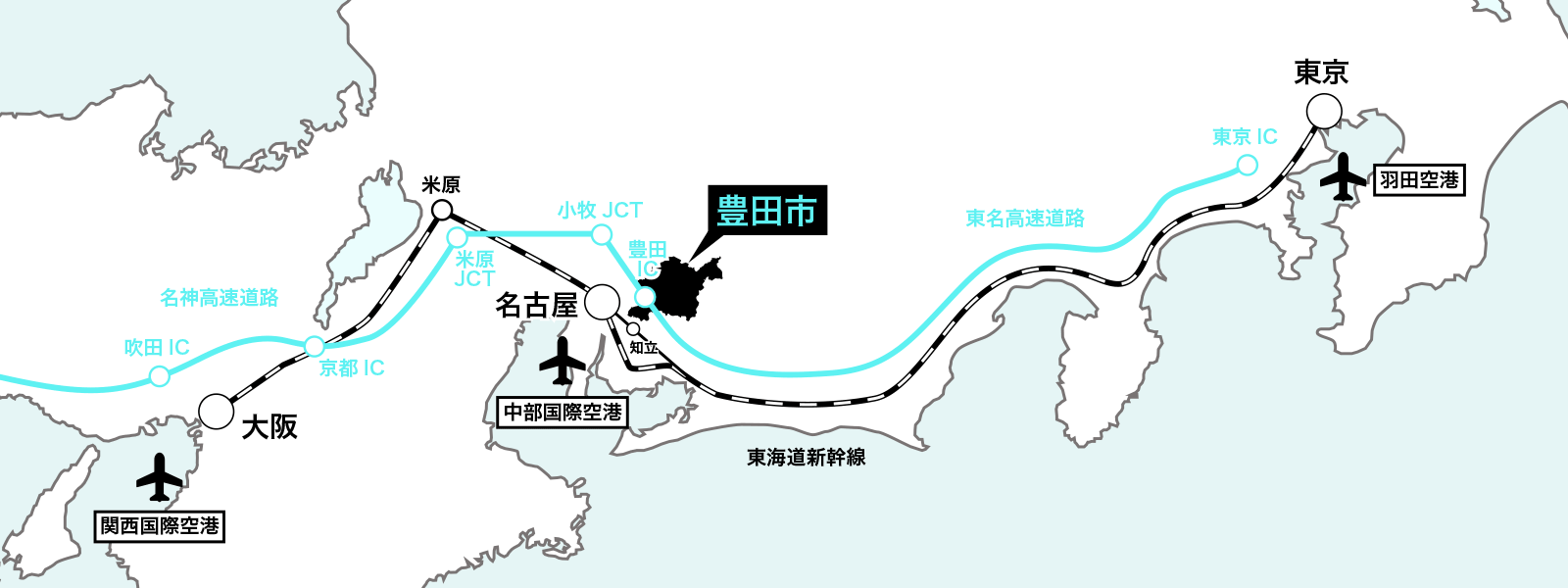 アクセス豊田市は日本のほぼ中心に位置し、関東・関西方面からのアクセスも良好です。